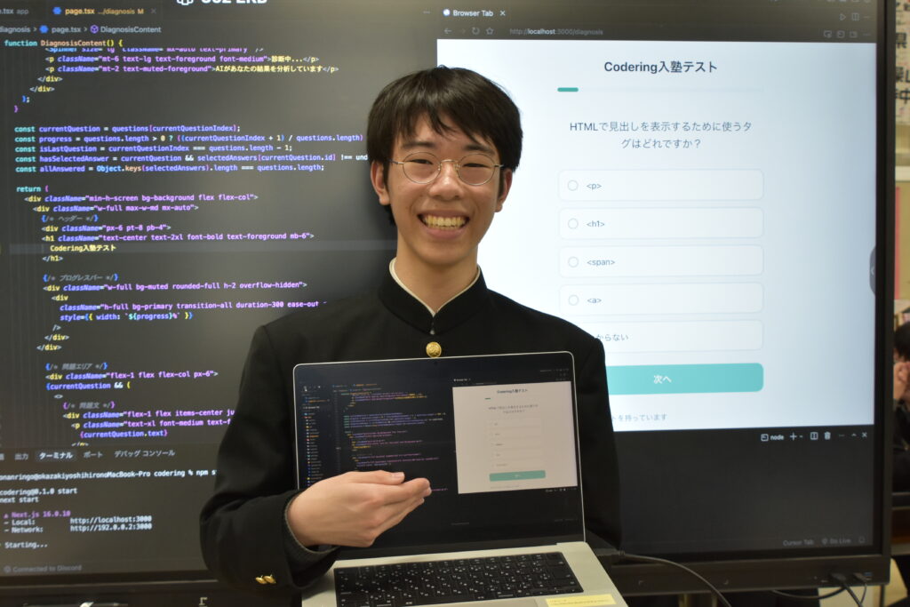 AIが進化する時代だからこそコードの読み書きが必要と考え、AIのサポートを受けながらプログラミングを学べるアプリ「Codering」を開発しています。開発にあたって、経済産業省のAKATSUKIプロジェクトの一つであるORANGE AI Projectに採択され、開発支援金やメンターによる支援、発表の機会を得ました。メンターとのディスカッションや、発表を行うたびに研究内容がブラッシュアップされていくことが楽しいです。