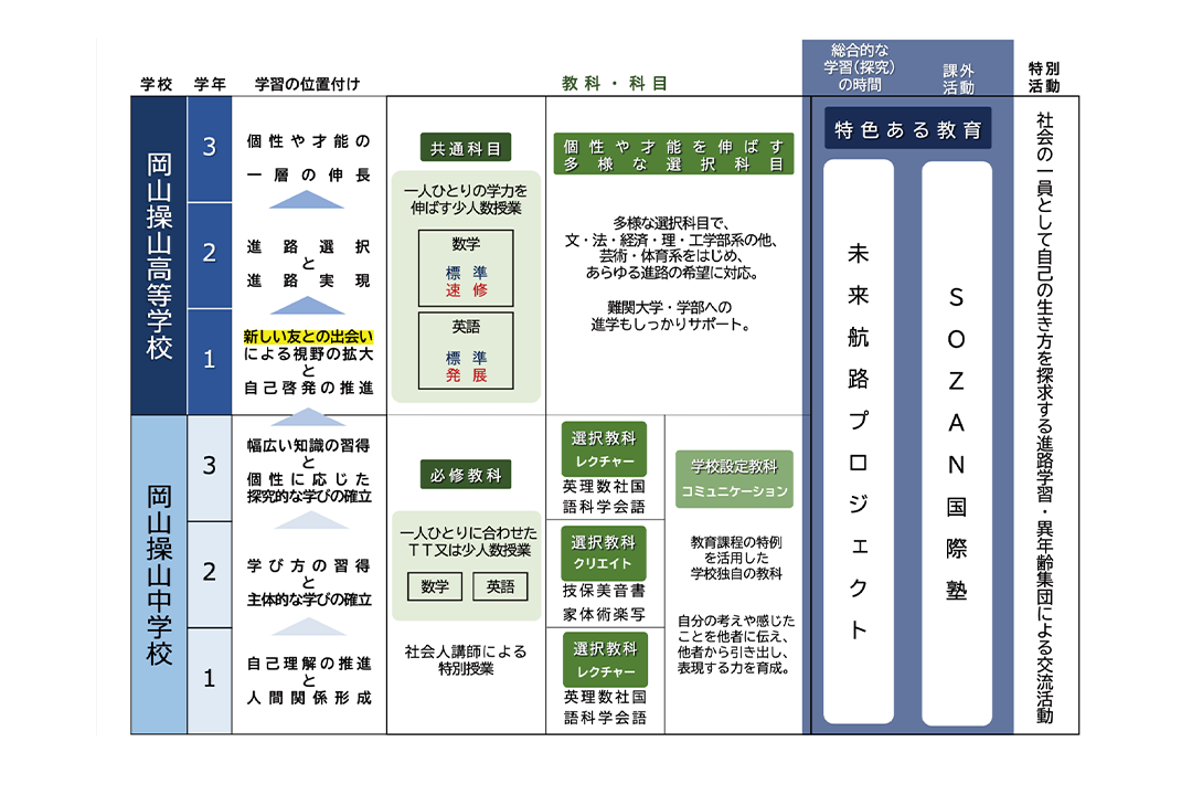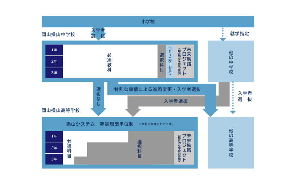 岡山操山中学校は岡山操山高等学校に併設された併設型の中高一貫教育校として、次の図のようなしくみになっています。