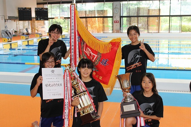平成26年7月19日(土)・20日(日)に倉敷市屋内水泳センターで行われた第52回岡山県総合体育大会水泳競技の部で女子総合成績第1位になりました。また,400mメドレーリレー第1位,200mバタフライ第1位,100mバタフライ第2位,100m平泳ぎ第1位,400m個人メドレー第2位,200m個人メドレー第2位など数多く入賞しました。なお400mメドレーリレー,400m個人メドレー,200m個人メドレーについては全国大会の標準記録を突破しており,8月に鳥取県で開催される中国中学校水泳競技選手権大会及び高知県で開催される全国中学校体育大会に出場いたします。![]()